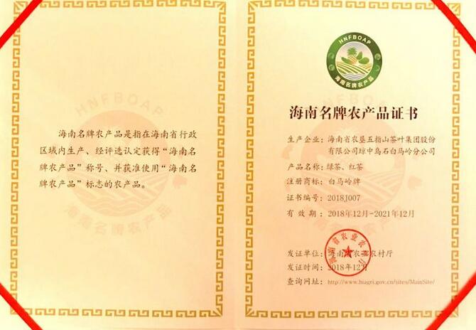 近日,海墾茶業(yè)集團(tuán)瓊中烏石白馬嶺茶業(yè)分公司生產(chǎn)的白馬嶺牌紅茶、綠茶被海南省農(nóng)業(yè)農(nóng)村廳評定為”海南名牌農(nóng)產(chǎn)品”并頒發(fā)證書,證書有效期2018年12月至2021年12月。
