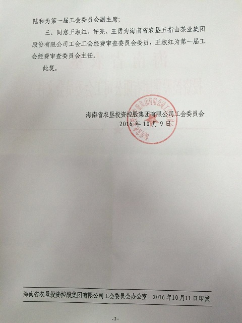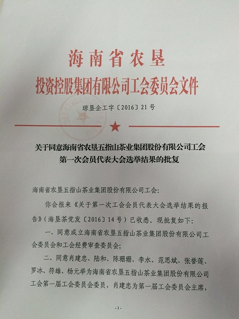 成立海南省農(nóng)墾五指山茶業(yè)集團(tuán)股份有限公司工會委員會和工會經(jīng)費(fèi)審查委員會的批復(fù)
