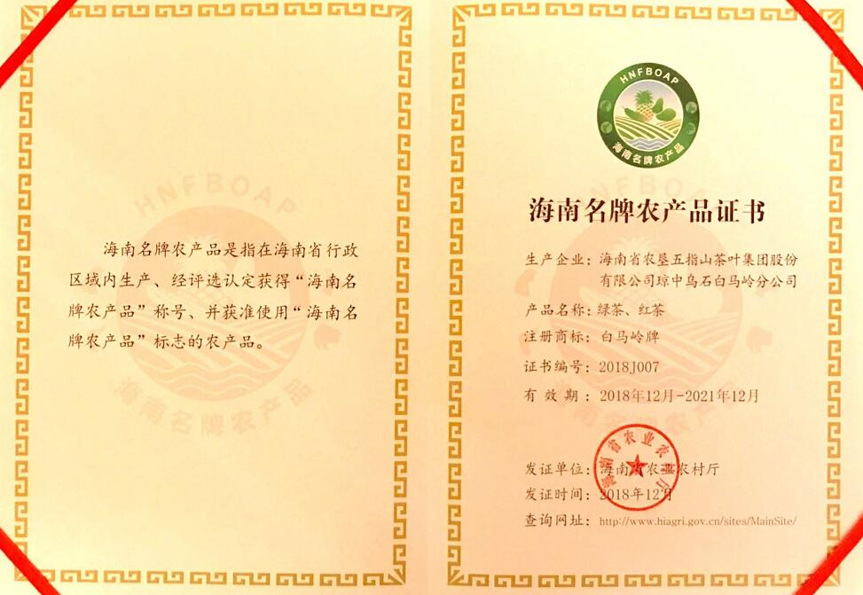 白馬嶺牌紅茶、綠茶被評(píng)定為“海南名牌農(nóng)產(chǎn)品”