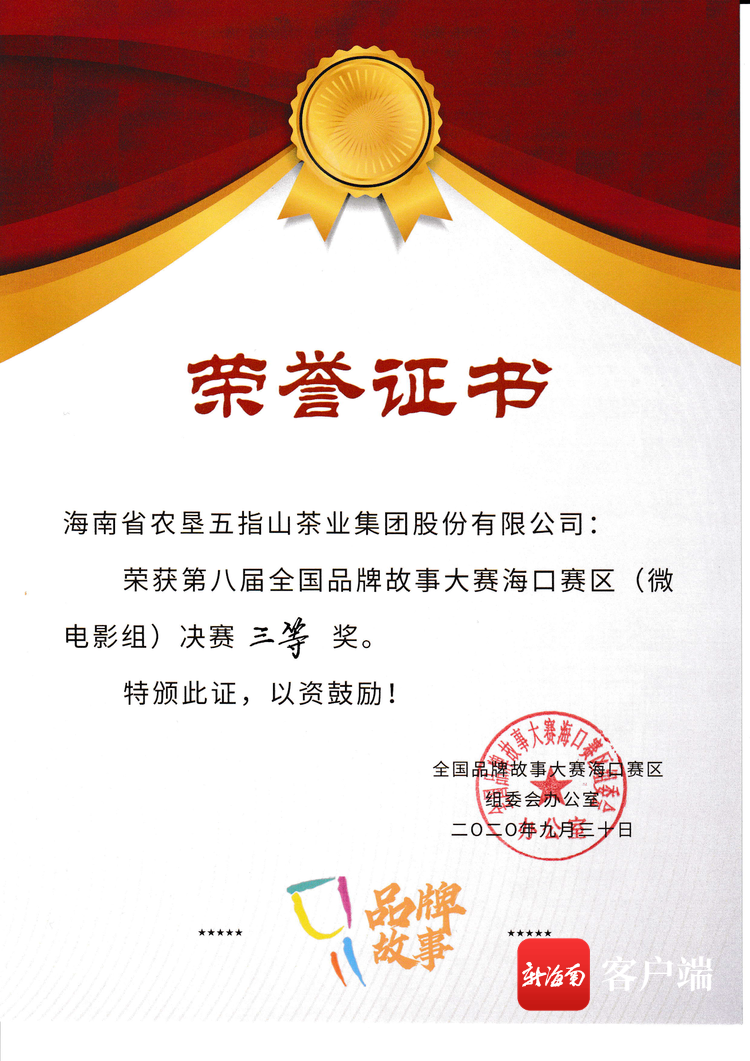 2020-10-14新海南客戶端、南海網(wǎng)、南國(guó)都市報(bào)9月30日消息(記者杜倬荷)9月30日,第八屆全國(guó)品牌故事大賽??谫悈^(qū)微電影決賽頒獎(jiǎng)儀式在??谂e行。海墾茶業(yè)集團(tuán)參賽作品《高香茶班領(lǐng)頭雁》,榮獲??谫悈^(qū)(微電影組)決賽三等獎(jiǎng)...